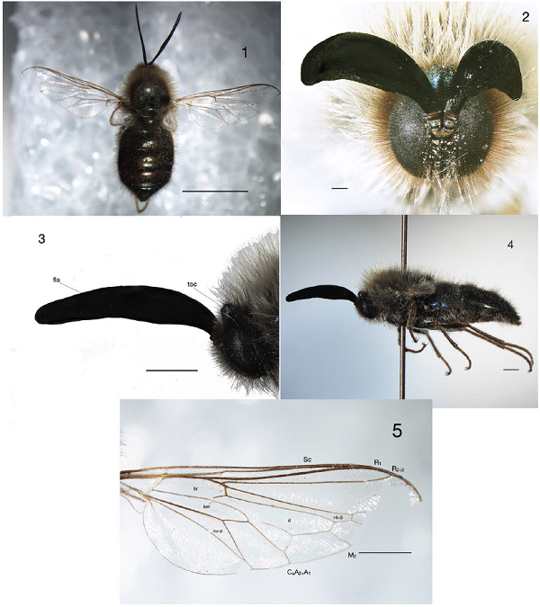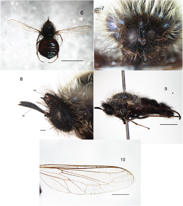 Holotipo macho. Longitud: 10.2 mm; ala: 8.4 mm. Cabeza negruzca. Ojos marrón oscuros, muy separados bajo la inserción antenal (fig. 2), levemente sobre ella, con abundante pilosidad marrón erecta y margen posterior redondeado. Occiput grande, alrededor de 1/3 de la cápsula cefálica. Triángulo ocelar azul verdoso iridiscente, elevado (0.58 mm) (fig. 3), más bien romo en su cúspide, con un pequeño promontorio delantero y 2 posteriores más elevados y paralelos, presentando en su parte anterior pilosidad similar a la de los ojos, aunque más corta, mientras que en su parte posterior la pilosidad es cenicienta, más escasa y larga, con 2 ocelos presentes. Frente y cara negruzca brillante con pilosidad blanquecina larga y rala, sobre todo en su parte inferior, similar a la del tórax, con lados subparalelos, suavemente sinuosos en el medio con un par de quillas no muy elevadas. Piezas bucales diminutas, no se aprecia probóscide. Antenas alargadas e insertadas ligeramente sobre la parte media de la frente (fig. 3); escapo y pedicelo marrón, flagelo negro opaco, los 2 primeros de forma sublenticular, achatados, siendo el pedicelo de mayor tamaño, ambos con áreas con micropubescencia blanquecina, especialmente en sus márgenes; flagelo largo (5.6 mm) aproximadamente 3x la altura del ojo, ancho 0.5x la altura del ojo, comprimido lateralmente, algo cóncavo e irregular en su cara interior, sin setas apicales; escapos no fusionados e insertados en la mitad de la frente. Tórax verdoso iridiscente, globoso, cubierto de densa y larga pilosidad cenicienta; pleuras verdosas azules tornasoladas con todos los escleritos con abundante y larga pilosidad cenicienta (fig. 4). Patas marrón oscuro; coxas marrón verdosas y con larga y abundante pilosidad cenicienta, fémures y tibias con pilosidad erguida amarillenta blanquecina, más larga en los fémures; fémur medio y posterior sólo con espina externa, borde interno inerme; tibia anterior con una espina terminal externa bien desarrollada, la cara interna con 2 de menor tamaño; tarsos con pilosidad amarillenta corta; empodio y pulvilos bien desarrollados, subiguales en longitud. Alas hialinas, sin máculas, setas o micropilosidad (fig. 5); costa extendiéndose hasta el ápice del ala, vena humeral presente; Sc bien marcada y uniéndose, por largo trecho, con la C y la R1; R1 alcanzando el margen del ala por encima del ápice de ésta y uniéndose a la R2+3; R4 y R5 presentes, ambas alcanzan el borde del ala (lo que cuesta apreciar, ya que ambas alas del ejemplar están muy deterioradas en su ápice); celda r1 cerrada en el margen del ala; M1, M2 y M3 presentes y alcanzando el margen del ala; A2 apenas perceptible, desaparece sin alcanzar la mitad del lóbulo anal; celda m3 subtriangular, abierta en su parte superior; celda d alargada; alula presente; base y pedicelo del halter marrón claro, extremo amarillo; caliptra inferior traslúcida, con márgenes marrón claro y larga pilosidad blanquecina; halter marrón claro. Abdomen verdoso oscuro iridiscente, alargado de lados subparalelos y con pilosidad cenicienta similar a la del tórax, pero menos abundante, con 6 tergitos y 7 esternitos visibles. Tergito I corto, II al IV de igual largo, V y VI agudizándose hacia el ápice, de forma subtriangular, V 0.75x el largo del esternito IV, VI muy pequeño.