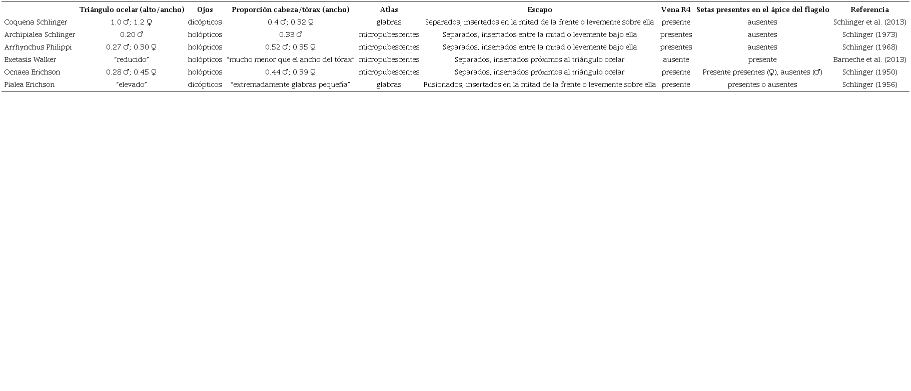 En la tabla 1 se comparan los ejemplares de Coquena coquimbensis sp. nov. (1 ♂; 1 ♀) con especímenes examinados de la rama Ocnaea de Panopinae (sensu Schlinger, 1968): A. chilensisSchlinger, 1973 (1 ♂), A. vittatus Philippi, 1871 (2 ♂♂; 1 ♀) y Ocnaea sp. (1 ♂; 2 ♀♀), esta última de Perú. No se pudieron examinar especies de Exetasis Walker, 1852 y Pialea Erichson, 1840, por lo que se emplearon las descripciones de Barneche et al. (2013) para Exetasis y de Schlinger (1956) para Pialea, respectivamente.
