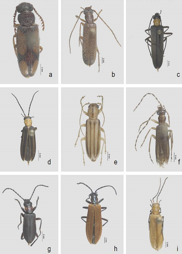 La familia Oedemeridae se distribuye a nivel mundial (Lawrence et al., 1999), principalmente en las regiones tropicales (Vázquez, 1993). La familia se divide en 3 subfamilias: Polypriinae Lawrence, 2005 (fig. 1a), Calopodinae Costa, 1852 (fig. 1b) y Oedemerinae Latreille, 1810, esta última conformada por las tribus Asclerini Gistel, 1848 (fig. 1c-f), Ditylini Mulsant, 1858 (fig. 1g, h), Nacerdini Mulsant, 1858 (fig. 1i), Oedemerini Latreille, 1810 y Stenostomatini Mulsant, 1858 (Bouchard et al., 2011; Lawrence, 2005). Actualmente se conocen 115 géneros y 1,500 especies de edeméridos (Britton, 1970; Vázquez, 1993). En la región Neotropical se tiene registro de 28 géneros y 307 especies (Navarrete-Heredia y Fierros-López, 2001). El primer registro en México es el realizado en la obra “Biologia Centrali-Americana” (Champion, 1890). Posteriormente, en la mitad del siglo XX, su conocimiento se vio incrementado por Arnett (1951, 1953, 1956a, 1956b, 1960, 1963, 1964, 1965), con algunas descripciones de especies en el norte del país.