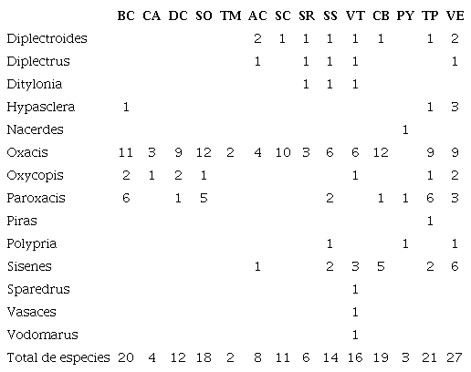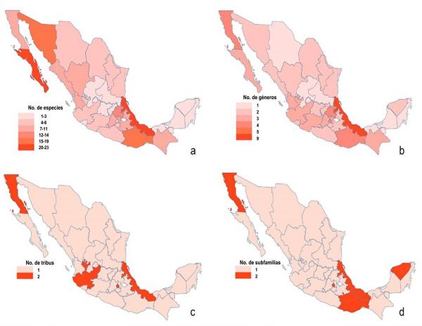 México cuenta con 3 subfamilias, 14 géneros y 77 especies de Oedemeridae. Se registran por primera vez para el país a Oxacis albolineata Pic, 1926, O. sericea Horn, 1870, Oxycopis notoxoides (Fabricius, 1801), Paroxacis interrita (Arnett, 1951) y P. recendita (Arnett, 1951), y se proporcionan 95 registros nuevos a nivel estatal. El mayor número de especies se presenta en Veracruz (23 especies, 9 géneros), Baja California Sur (20, 4), Sonora (18, 3), Oaxaca (17, 5) y Guerrero (14, 5). La mayoría de los estados registran menos de 5 especies, mientras que Tlaxcala no cuenta con ningún registro (fig. 2a, b). En la mayoría de los estados se presentan menos de 2 subfamilias y tribus (fig. 2c, d).