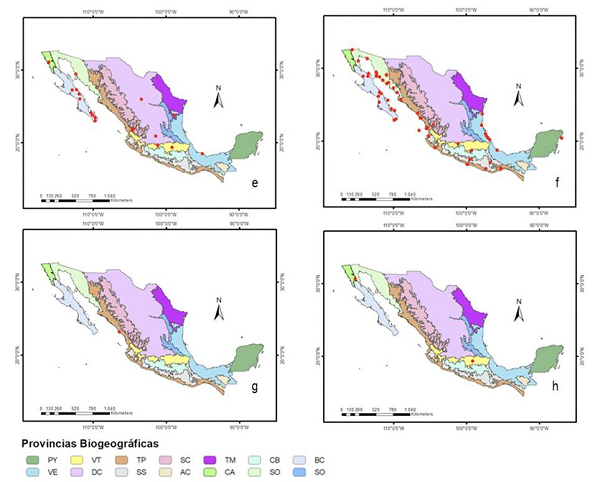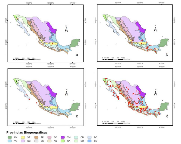 Morrone, J. J., Escalante, T. y Rodríguez-Tapia, G. (2017). Mexican biogeographic provinces: map and shapefiles. Zootaxa, 4277, 277-279. https://doi.org/10.11646/ zootaxa.4277.2.8
