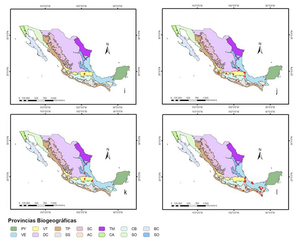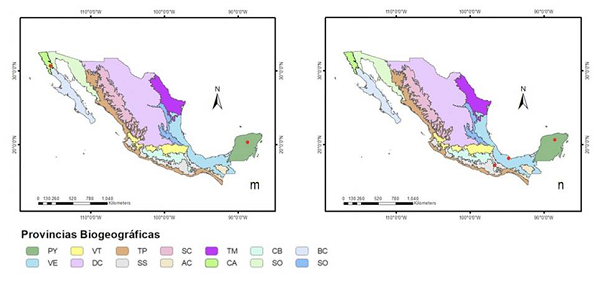 Las regiones y provincias siguen el criterio de Morrone et al. (2017), las abreviaturas utilizadas son: región Neártica (NEA), que incluye las provincias: Baja Californiana (BC), Californiana (CA), Desierto Chihuahuense (DC), Sonorense (SO) y Tamaulipeca (TM); la Zona de Transición Mexicana (ZTM), que comprende las Tierras Altas de Chiapas (AC), Sierra Madre Occidental (SC), Sierra Madre Oriental (SR), Sierra Madre del Sur (SS) y la Faja Volcánica Transmexicana (VT); y la región Neotropical (NEO), con las provincias de la Cuenca del Balsas (CB), Península de Yucatán (PY), Tierras Bajas del Pacífico (TP) y Veracruzana (VE). La elaboración de los mapas se realizó en ArcGIS Desktop 10.6 (ESRI, 2011).