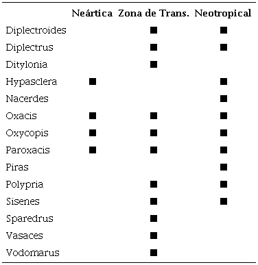 Los edeméridos de México presentan elementos de las regiones Neártica y Neotropical, con especies que particularmente se distribuyen en la Zona de Transición Mexicana. La mayoría de los géneros se distribuyen en la Zona de Transición Mexicana y la región Neotropical (tabla 1). La región Neotropical presenta mayor riqueza (49 especies, 10 géneros) en comparación con la región Neártica (33, 4). Las provincias con mayor riqueza son la Veracruzana (27, 8), Tierra Bajas del Pacífico (21, 7) y Baja Californiana (20, 4). Las provincias con menor número de especies son la Californiana (4 especies), Península de Yucatán (3 especies) y Tamaulipeca (2 especies) (tabla 2).
