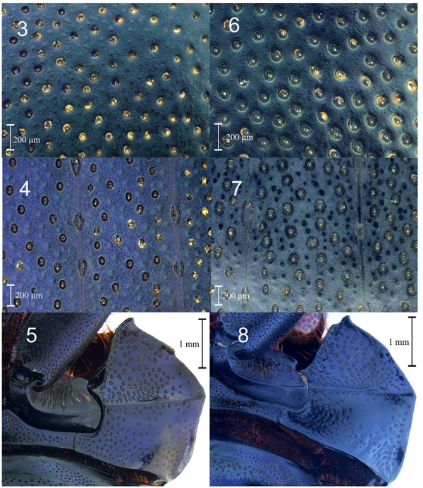 Male. Habitus: glossy metallic blue-green dorsally; integument lightly granulate, scabriculous (Fig. 1). Head: punctation deeply impressed, ocellate, reduced in size toward the clypeus, rounded. Each clypeal puncture bearing an inconspicuous seta. Clypeus bidentate. Genal suture distinctly impressed. Yellow antennae. Pronotum: glabrous dorsally. Pronotal punctation deeply impressed, ocellate, rounded, variable in size, becoming smaller in the anteromedial portion of disk (Fig. 3). Pronotal anterior angle acute; pronotal margin between anterior and medial lateral angles notched; pronotal margin between medial lateral and posterior angles straight; pronotal medial lateral angle rounded. Hypomeron carinate medially. Hypomeral carina inconspicuously indentate medially. Hypomeral punctures deeply impressed, ocellate, rounded, variable in size (Fig. 5). Elytra: elytral disk with inconspicuous humps. Striae fine, superficially impressed, without internal line. Strial punctures ocellate, deeply impressed, obtusely oval to round. Interstrial punctures ocellate, deeply impressed, variable in size. Strial punctures deeply impressed, ocellate, rounded (Fig. 4). Base of the interstriae 6 with carina short, strongly developed. Basal margin of the interstriae 3 and 5 bearing a tubercle inconspicuous, rounded. Apex of the interstriae 3-7 with carina or rounded tubercle. Tergite 8: punctation obtusely oval to rounded, ocellate, deeply impressed. Metasternum. Almost impunctate medially, with anterior and posterior fossae. Legs: protibiae tridentate, with apical projection short, tick. Profemur with indentation in frontolateral margin. Mesotibia with indentation in posteromedial margin. Metatibiae with indentation in posterolateral margin. Mesotrochanter with indentation strongly developed, projected posteriorly. Genitalia: apex of parameres rounded, indentate ventrally (Fig. 9). Endophallites as in Fig. 10.