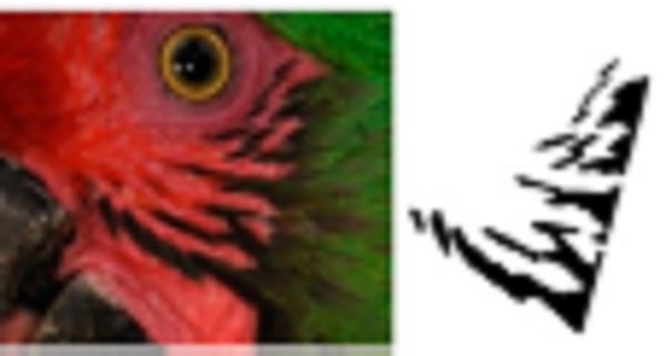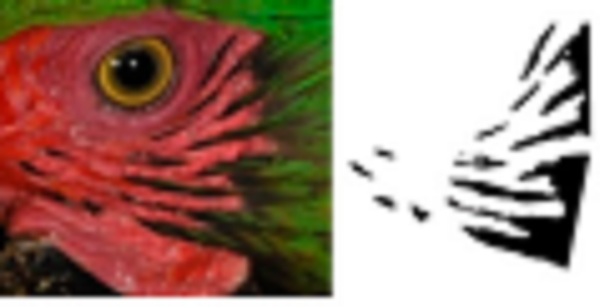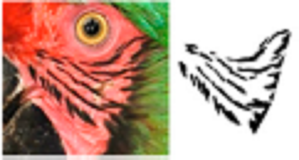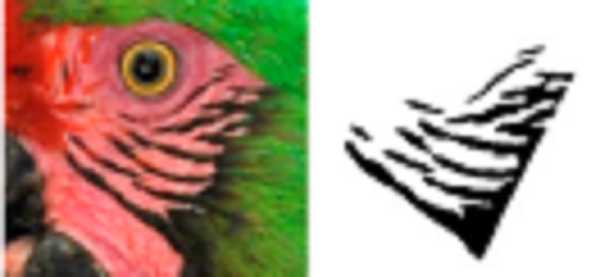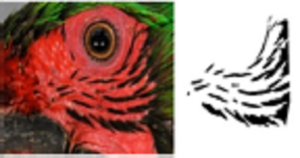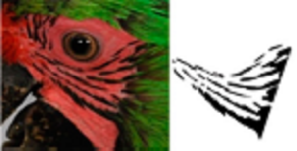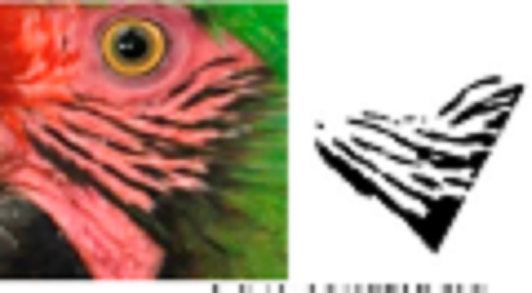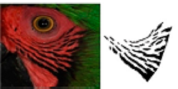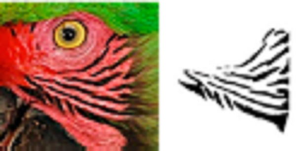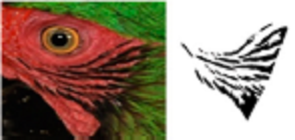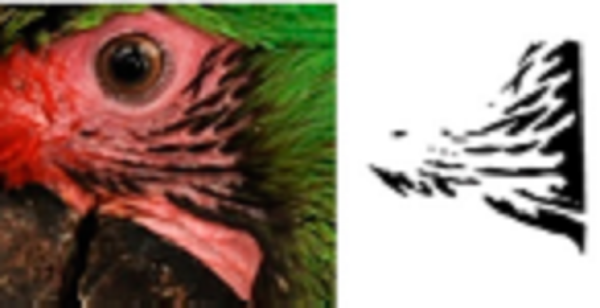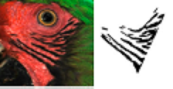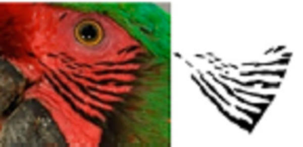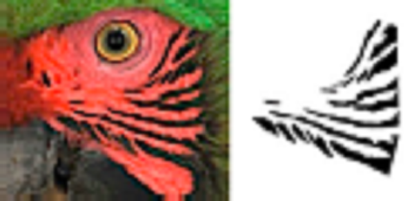 Using ADOBE PHOTOSHOP CS6, we recovered these feather patterns as follows: i) for each individual, feather patterns on the right and left sides of the face were selected from the original photograph using the magic wand tool (Fig. 1B); ii) based on the orientation and size, feather patterns of all individuals were homogenized by cutting to show only feathers patterns; iii) then, the investment color tool was used to fill the background (as white), leaving only the black feather patterns of the face (Fig. 1C), and iv) final images were saved in .bmp format.