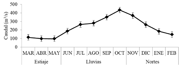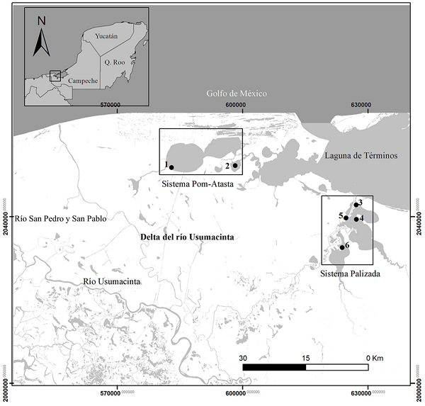 Los sistemas fluvio-lagunares estuarinos Palizada y Pom-Atasta se localizan en el estado de Campeche, México. Ambos sistemas tienen aporte de agua dulce de efluentes del río Usumacinta. En su desembocadura forman parte del Área de Protección de Flora y Fauna Laguna de Términos y del delta del río Usumacinta (Fig. 1). La zona presenta 3 temporadas definidas: estiaje de marzo a mayo, lluvias de junio a octubre, temporada en que se registra la mayor descarga de agua (Conagua, 2018) (Fig. 2), y nortes, de noviembre a febrero, caracterizada por la presencia de lluvias invernales (Yánez-Arancibia et al., 2013).