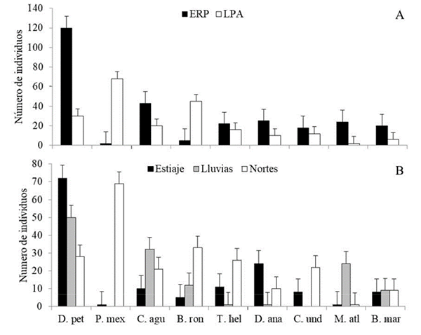 Las especies más abundantes en el SP fueron D. petenense y C. aguadulce, mientras que en el SPA fueron P. mexicana y B. ronchus (Fig. 3). La comparación temporal reveló que la abundancia de D. petenense fue mayor durante el estiaje, mientras que P. mexicana fue más abundante en nortes. Megalops atlanticus y C. undecimalis mostraron un incremento en la abundancia durante las temporadas de lluvias y nortes, respectivamente (Fig. 3).