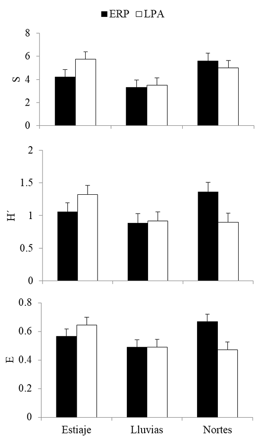 La abundancia específica varió de manera significativa entre temporadas (F = 1.771, p = 0.005) y espacio-temporalmente (F = -0.583, p = 0.021), pero no entre los sistemas (Tabla 4). Las mayores abundancias se presentaron en la temporada de nortes (268 individuos), seguido de la temporada de estiaje (183 individuos) y lluvias (152 individuos). La abundancia en el SP fue mayor en nortes, mientras que en el SPA se incrementó en estiaje (Fig. 4). Los valores de riqueza, diversidad y equidad fueron mayores durante la temporada de nortes y estiaje, respecto a lluvias (Fig. 4), sin embargo, estos resultados no fueron estadísticamente significativos.
