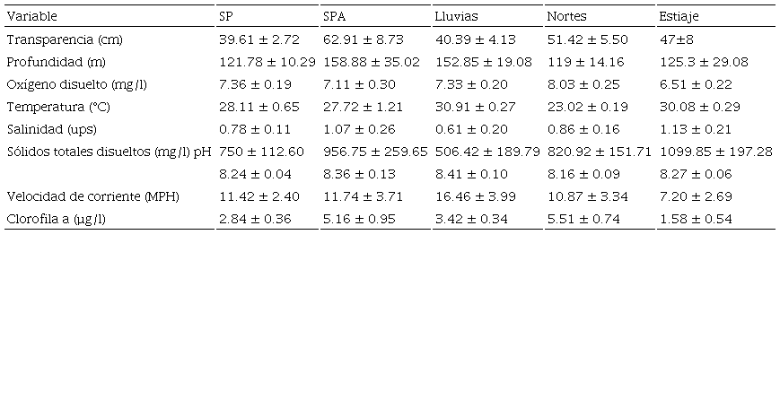 La concentración de clorofila a mostró diferencias entre sistemas (F = 10.999, p < 0.001), con valores más altos en SPA, y varío entre temporadas (F = 29.995, p > 0.001) con valores más altos en nortes y lluvias. Se evidenció el efecto significativo de la interacción espacio-temporal para el OD (F = 7.071, p <0.001), temperatura (F = -0.309, p = 0.042), salinidad (F = 5.273, p < 0.001), STD (F = 5.698, p <0.001), pH (F = 4.857, p = 0.001) y clorofila a (F = 1.827, p = 0.004). La profundidad y la velocidad de corriente no presentaron diferencias significativas.