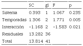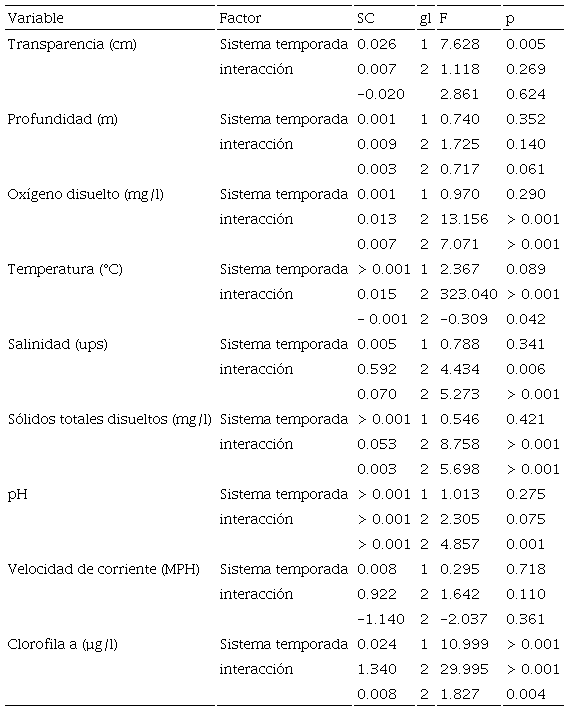 Las variables ambientales fueron transformadas con logaritmo (x + 1), después de no cumplir los supuestos de normalidad (Kolmogov-Smirnoff) y homoscedasticidad (Barlett). Las comparaciones se realizaron entre sistemas y temporadas con el fin de evaluar la variación espacial y temporal. Se utilizó un análisis de varianza de permutaciones de 2 vías (Permanova, 9,999 permutaciones) para comparar las variables ambientales entre sistemas, temporadas y conocer el efecto de la interacción de ambos (Anderson, 2001).