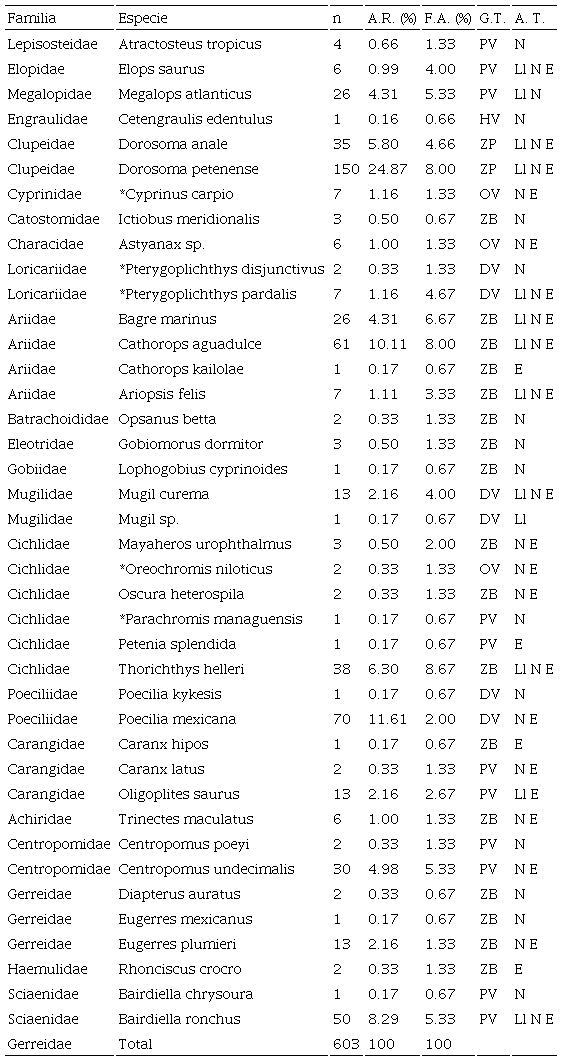 Se capturaron un total de 603 individuos pertenecientes a 15 órdenes, 23 familias, 31 géneros y 40 especies (Tabla 3). Las familias con mayor número de especies fueron Cichlidae (6 especies), Ariidae (4 especies), Carangidae y Gerreidae (3 especies, respectivamente). Las especies con mayor abundancia relativa fueron Dorosoma petenense (24.87%), Poecilia mexicana (11.69%) y Cathorops aguadulce (10.11%) (Tabla 3). Las especies con mayor frecuencia de aparición fueron Thorichthys helleri (8.67%), D. petenense (8%), C. aguadulce (8%), Bagre marinus (6.67%), Centropomus undecimalis (5.33%), Bairdiella ronchus (5.33%) y Megalops atlanticus (5.33%) (Tabla 3).