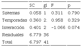 La abundancia relativa de cada especie y de los gremios tróficos se obtuvo por sistema y temporada, dividiendo el número total de individuos por especie o gremio entre el número total de individuos colectados, el resultado se multiplicó por 100 (Moreno, 2001). La frecuencia de aparición se estimó por sistema y temporada, dividiendo el número de sitios de aparición de la especie entre el número total de sitios, el resultado se multiplicó por 100 (Moreno, 2001). Se determinaron los siguientes atributos de la comunidad por sistema y temporada: abundancia específica de cada especie y de los gremios tróficos (n), riqueza (S), diversidad (Shannon-Wiener H’) y equidad (E) (Simpson 1-D), los cuales fueron transformados con logaritmo (x + 1) después de no cumplir los supuestos de normalidad (Kolmogov-Smirnoff) y homoscedasticidad (Barlett) (Quinn y Keough, 2002). Los atributos se compararon con un análisis Permanova de 2 vías (9,999 permutaciones), para determinar las diferencias espaciales, temporales y la interacción de ambos (Anderson, 2001).