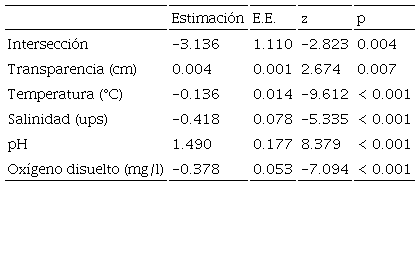 El análisis del MLGM se realizó con las abundancias específicas, debido a que fue la única característica de la comunidad que mostró diferencias significativas entre temporadas. Los resultados revelaron que la transparencia, la temperatura, la salinidad, el oxígeno disuelto y el pH fueron las variables ambientales con mejor predicción de la variación temporal de la abundancia de especies (Tabla 6).