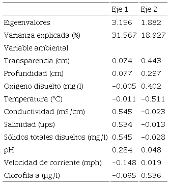 Para evaluar la influencia de las variables ambientales en la ictiofauna, primero se realizó una selección de variables ambientales, con la finalidad de minimizar la multicolinealidad entre variables y maximizar la correlación con la abundancia y riqueza de especies (modificado de Mellín et al., 2010). Se realizó un análisis de componentes principales (ACP) de las variables ambientales usando una matriz de correlación, los eigenvalores definieron las variables más importantes (Davis, 1986) (Apéndice). Estas variables se usaron en un análisis de correlación de Pearson (Press et al., 1992), se identificaron las variables altamente correlacionadas y redundantes (p > 0.05) (Apéndice) que fueron removidas del análisis. Utilizando las variables ambientales no correlacionadas y la abundancia de especies por temporada, se realizó un modelo lineal general mixto (MLGM) asumiendo una matriz de Poisson (McCullagh y Neider, 1989). El modelo fue seleccionado con base en el criterio de información de Akiake, el criterio de información Bayesiano y el porcentaje de devianza. El modelo predijo las variables más importantes relacionadas con los cambios en la abundancia de peces.