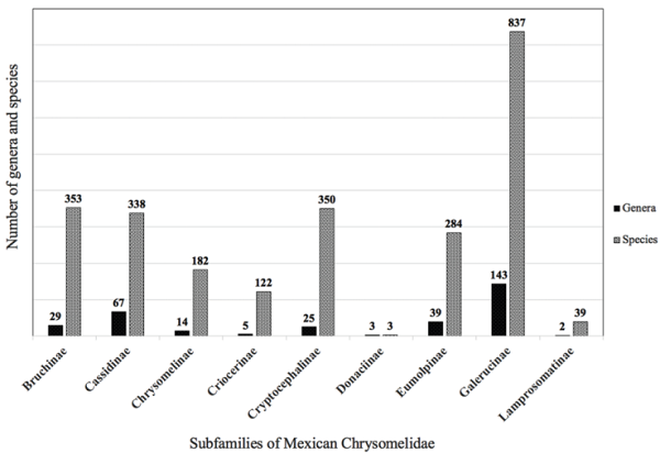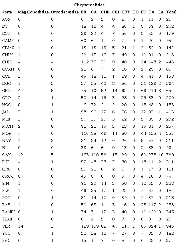 Mexican states distribution.Table 2 presents an update of leaf beetles species richness by state provided by Ordóñez-Reséndiz et al. (2014), supplemented with data for seed beetles (i.e. Bruchinae). The species richness of 7 Mexican states is less than 100 species, 21 states have between 100 and 500 species, and only 4 Mexican states register more than 500 species. Donaciinae and Lamprosomatinae are the subfamilies of Mexican Chrysomelidae with the lowest species richness and the lowest state distribution.