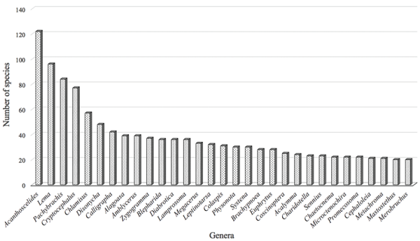 The Appendix contains the families of leaf beetles according to Bouchard et al. (2011) classification scheme. The family Chrysomelidae is currently represented in Mexico by 2,508 species and 327 genera, it is more diverse than Megalopodidae, with 31 species and 3 genera, or Orsodacnidae, with 17 species and 2 genera (Table 1). Among the Chrysomelidae subfamilies, Galerucinae with 837 valid species, Bruchinae with 353 species, Cryptocephalinae with 350 species, Cassidinae with 338 species, and Eumolpinae with 284 species, representing 86.2% of the family and are more diverse than the others (Fig. 1). There were 31 genera with 20 or more species (Fig. 2), Acanthoscelides, Lema, Pachybrachis, Cryptocephalus, Chlamisus, Disonycha, Calligrapha, Alagoasa, and Amblycerus include 23.6% of Mexico’s total leaf beetles richness. There were 222 genera represented by 5 or fewer species.