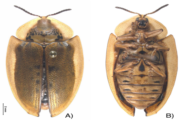 New records. We found 1 species herein newly cited for Mexico and 16 species from states not previously registered, most of them were from San Luis Potosí, a state poorly explored. The new country record of Physonota gigantea Boheman, 1854 (Fig. 3) is congruent with the previously known distribution. This species is known from Chile, Costa Rica, Ecuador, El Salvador, Guatemala, Honduras, and Nicaragua (Borowiec, 1999; Borowiec & Świętojańska, 2020). We examined the following material from Mexico: GRO, Icatepec, Taxco de Alarcón, deciduous forest, 18°23’39.8” N, 99°35’57.1” W, 1,198 m, 31.VII.2014, M. Ordóñez and S. López coll., P. gigantea Boheman M. Ordóñez det. 2014 (CCFES-Z, 2); km 45 Coyuca de Catalán-Zihuatanejo, 8.VI.1984, H. Brailovsky coll., P. gigantea Boheman S. López det. 2015 (CNIN, 1). For the next 16 species we registered new records for Mexican states: