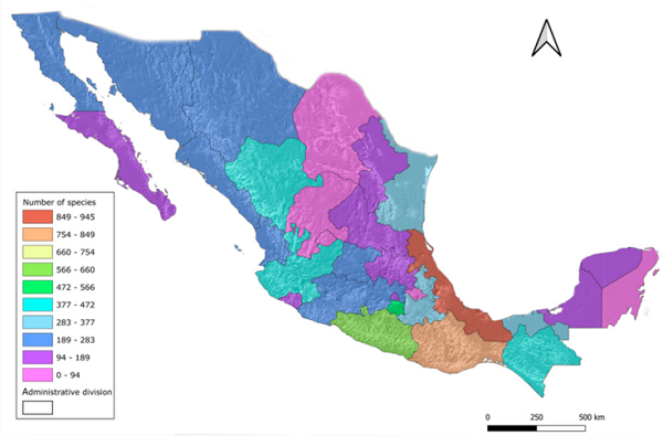 Figure 4 illustrates the distribution of species richness for each state synthesized in Table 2. A diversity gradient from south to north is observed; the states with the highest species richness are Veracruz (945), Oaxaca (799), Guerrero (654), and Morelos (535). Some north Mexican states break this gradual shift of richness, like Durango (394) and Tamaulipas (345), states that have a high number of leaf beetle species, as well.