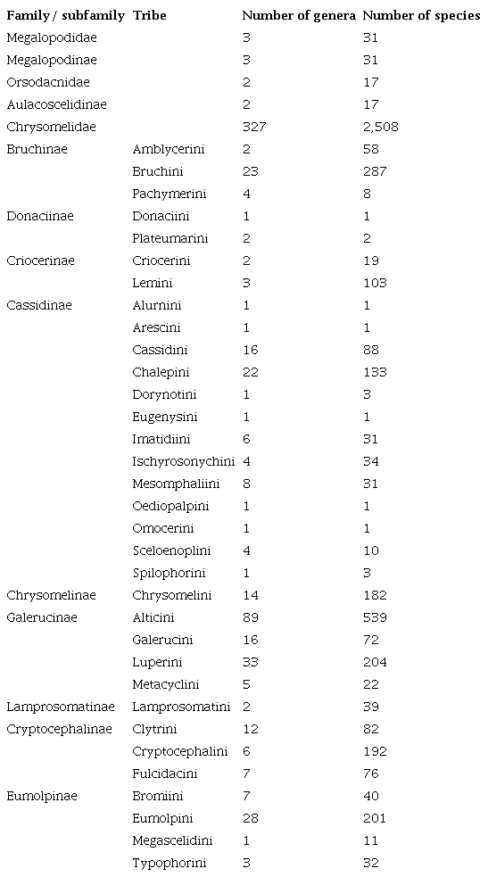 We assembled a checklist of leaf beetles (Coleoptera: Megalopodidae, Orsodacnidae, and Chrysomelidae) with more than 4,565 names from which the final list was obtained (Appendix). In total, 2,556 valid species and 127 subspecies, beloging to 332 genera, 18 subtribes, 33 tribes, 11 subfamilies, and 3 families are listed to date. In addition, 1,884 synonyms are included.
