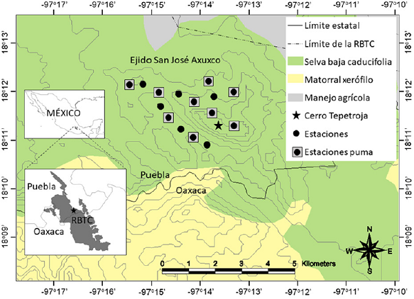 El área de estudio fue el ejido de San José Axuxco, municipio de San José Miahuatlán, Puebla, dentro de la RBTC y colindante con el estado de Oaxaca (fig. 1). El fototrampeo se llevó a cabo en el cerro Tepetroja con cima en las coordenadas geográficas 18°11'52.2" N, 97°12'26.3" O y altitud de 900 a 1,400 m snm. La vegetación en el cerro Tepetroja es selva baja caducifolia con cactáceas columnares de los géneros Cephalocereus, Myrtillocactus, Neobuxbaumia y Pachycereus como principales dominantes fisonómicos y árboles de copas extendidas y arbustos principalmente de los géneros Bursera, Castela, Ceiba, Ficus, Fouquieria, Parkinsonia y Ziziphus (Rzedowski, 1978; Valiente-Banuet et al., 2000). El clima es semiárido con lluvias en verano de mayo a octubre, precipitación promedio anual de 300 mm y temperatura media anual de 22 °C (Dávila et al., 2002).