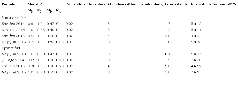 De los 24 periodos de 2 meses analizados, solo obtuvimos historias de captura-recaptura en 4 periodos para 5 pumas (3 hembras y 2 machos) y también en 4 periodos para 15 gatos monteses (tabla 1). La abundancia entre periodos varió para el puma de 3 a 9 individuos y para el gato montés de 3 a 8 individuos en el cerro Tepetroja, la probabilidad de captura fue similar para las 2 especies de felinos y el periodo con mayor abundancia para ambos felinos fue may-jun de 2015 en la temporada de lluvia (tabla 1).