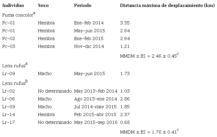 Las estimaciones de MMDM para pumas y gatos monteses en el cerro Tepetroja fueron acordes a la relación positiva esperada entre tamaño corporal y área de actividad en mamíferos; es decir, que el puma, por ser el felino más grande, presentó un MMDM mayor en comparación con el gato montés en el cerro Tepetroja, RBTC (Harestad y Bunnel, 1979; Lindstedt et al., 1986). Asimismo, nuestros resultados fueron congruentes con estudios previos sobre distancias de desplazamiento y áreas de actividad de los felinos. La MMDM de 2.46 + 0.45 km calculada para pumas en nuestro estudio fue similar a las estimaciones publicadas para el centro de México, en el Parque Natural Sierra de Nanchititla (674 km2), donde la distancia máxima de desplazamiento para 8 pumas varió de 2.4 a 3.6 km en selva baja caducifolia (Soria-Díaz et al., 2010). En la Reserva de la Biosfera Chamela-Cuixmala (RBCC, 131 km2), Jalisco, mediante radio-telemetría, se estimó el promedio de la distancia de desplazamiento diario de pumas machos en 2.14 ± 1.4 km durante la temporada seca (feb-may) y en 2.90 ± 1.7 km durante la temporada de lluvia (jun-nov) y el tamaño del ámbito hogareño fue estimado para las hembras de 25 a 60 km2 y para los machos de 67 a 97 km2 (Núñez-Pérez y Miller, 2019). En la RBCC, jaguares, pumas y ocelotes (Leopardus pardalis) coexisten en selva baja caducifolia y existe evidencia de la presencia de gato montés (López-González et al., 1998; Núñez-Pérez y Miller, 2019). Para el gato montés no encontramos información sobre estimaciones previas de la distancia de desplazamiento en el centro de México, lo que convierte a nuestra estimación (MMDM = 1.76 ± 0.41 km) en la primera. Sin embargo, en la Reserva de la Biosfera Mapimí, en el desierto Chihuahuense, se estimó la distancia diaria de desplazamiento en 4.9 + 0.7 km y el ámbito hogareño en 25.9 + 3.7 km2 para 4 hembras y 4 machos equipados con collares GPS de telemetría (Elizalde-Arellano et al., 2012). El desierto Chihuahuense presenta un clima más árido y extremoso que la RBTC y la disponibilidad de recursos para los felinos es menor, lo que puede ocasionar que los gatos se vean en la necesidad de recorrer mayores distancias para encontrar su alimento, cobertura y refugio, en comparación con los félidos de la RBTC donde las presas son abundantes y la vegetación provee de cobertura densa (Berruecos-Pérez, 2015; Cruz-Jácome et al., 2015; Elizalde-Arellano et al., 2012).