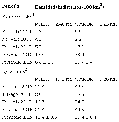 El promedio de la densidad absoluta estimada para el puma fue de 6.8 ± 2.0 ind/100 km2 con MMDM y 15.7 ± 4.7 ind/100 km2 con ½ MMDM. Para el gato montés, el promedio de la densidad absoluta fue de 15.4 ± 3.5 ind/100 km2 con MMDM y de 35.4 ± 8.1 ind/100 km2 con ½ MMDM (tabla 3). Elegimos los valores de densidad basados en MMDM debido a que fueron más congruentes que los valores basados en ½ MMDM y para evitar la sobreestimación de la densidad poblacional (Di Bitteti et al., 2006; Kelly et al., 2008; Tobler y Powell, 2013).