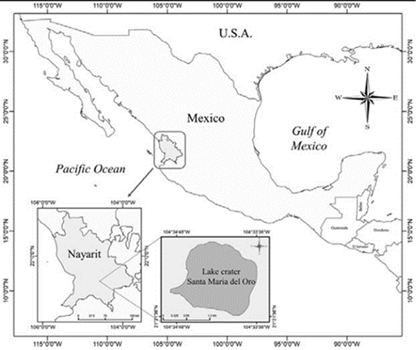 Santa María del Oro crater lake, is a subtropical water body located southeast from the City of Tepic, in Nayarit, Mexico, (21°23’ N, 104°35’ W; 750 m asl) (Fig. 1). The lake is classified as warm monomictic, stratified for 7 months with anoxic hypolimnion (May to December) and complete mixing between January and March (Vázquez-Castro et al., 2008). It has a surface area of about 3.7 km2 and a maximum depth of 65 m. The annual average precipitation in the region is 1,214 mm year-1 and a pH mean of 8.8 (Vázquez & Caballero, 2013).