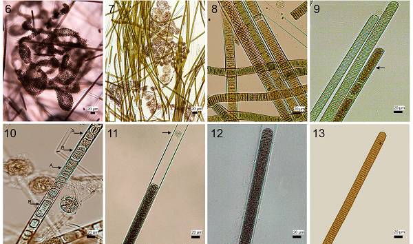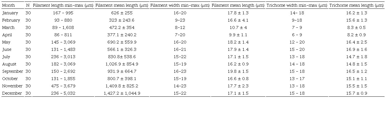 The filamentous individuals formed scums and irregular clusters intermingled with Microcystis aeruginosa (Fig. 7). Filaments were straight or slightly curved (Fig. 8), length ranged between 88.5 and 5,032.1 μm (mean of 912.7 ± 727.4 μm); width varied from 7.5 to 23.4 μm (mean of 16.8 ± 2.9 μm). Trichomes were straight, cylindrical and not constricted at cross-walls; width varied between 6.3 and 19.8 μm with a mean of 14.3 ± 3.2 μm; apical cells were widely rounded, without calyptra. Aerotopes were not regularly distributed along the whole trichome (Fig. 9). Hormogonia varied in length and cell numbers (2-12), also we observed monocytes (Fig. 10). Sheaths were firm, colorless, sometimes widened, surpassing the trichomes in form of a firm tube (Figs. 11, 12). The above morphological traits correspond to Limnoraphis robusta, however, morphometric characteristics show important variations over the year (Figs. 12, 13). Table 1 shows that during the bloom (February, March, and April), filament length and width and trichome width decreased considerably; then after the bloom, all morphometric characters stabilized. In April, we observed year minimum values for the filament mean length (377.1 ± 240.2 μm), width (9.9 ± 1.1 μm), and trichome width (8.2 ± 0.9 μm).