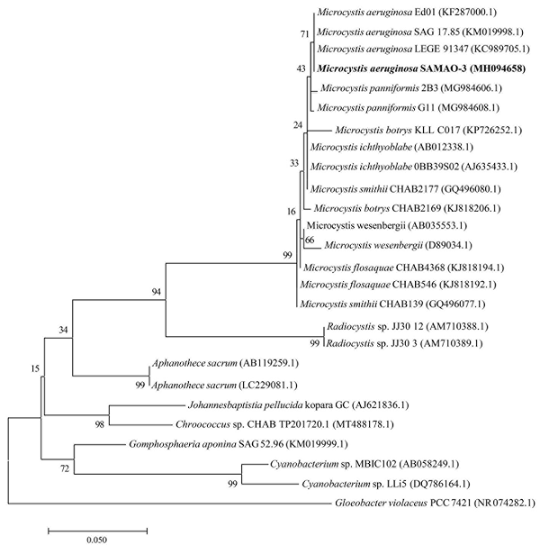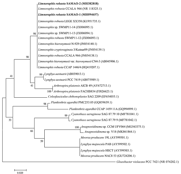 The analyses were performed based on maximum likelihood (ML) (Saitou & Nei, 1987) available in MEGA v7 software (Kumar et al., 2016). For ML, the evolutionary substitution model K2 + G was solved as the best one found using the MEGA v7 algorithms. The parameters (base frequencies, rate matrix of substitution types and shape of gamma distribution) were estimated from the data. One thousand bootstrap replicates were performed for ML analyses. Nucleotide sequences of the studied strains were deposited in GenBank under the accession numbers MH094657 (Limnoraphis robusta SAMAO-1), MH382818 (L. robusta SAMAO-2), and MH094658 (Microcystis aeruginosa SAMAO-3).