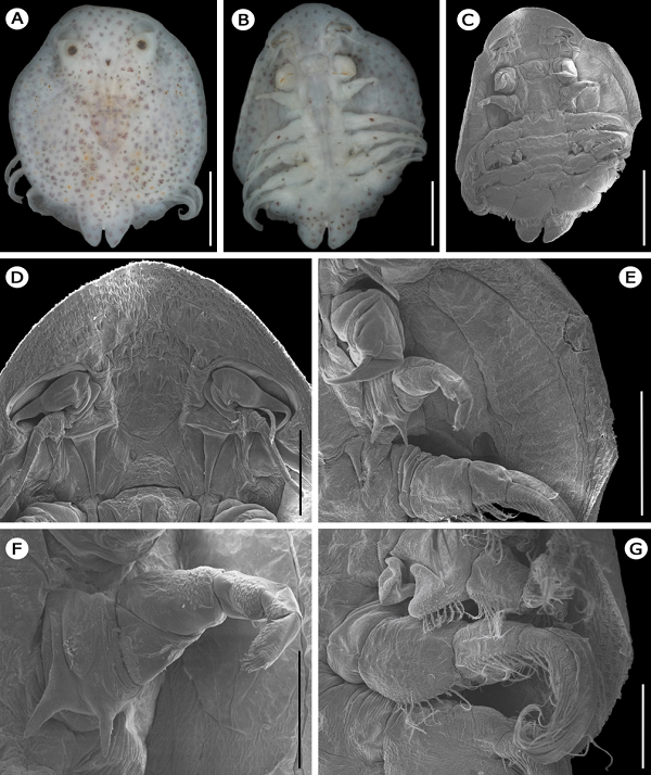 Description. Specimens are small (3.2-4.1mm length) and dorsoventrally flattened; color white-yellow. Nauplius and compound eyes present, located on dorsal surface. Carapace rounded with lateral lobes reaching the 4th pair of swimming legs. Lobes separated by a rounded sinus at the level of the 1st and 2nd legs. (Fig. 1A). Dorsal surface covered by numerous conspicuous dendriform spots, most of them brown and purple, few spots yellow (Fig. 1A). In ventral view, conspicuous dendriform spots distributed on the margins of the carapace, legs, and on natatory and abdominal lobes (Fig. 1B). Marginal spines over the entire carapace edge; extending from the anterior tip to the posterior end of the respiratory areas (Fig. 1C). Oval antero-lateral depressions, well defined (Fig. 1D). Antennules with thick rounded base and distal claws stout and tipped. Antenna thin, divided into 4 segments, with a group of bristles at the base and a group of apical spines on the terminal segment; without ornamentation at middle segments (Fig. 1D). Mouth without pre-oral sting. Suction disks absent (Fig. 1C,, D). First maxillae with 2 distal claws, proximal claw smaller than the terminal (Fig. 1E). Second maxillae divided into 6 segments; first segment with 2 teeth, second segment triangular, segments 4 to 6 with pectinate scales, terminal segment with stout setae (Fig. 1E, F). Thorax formed by 4 segments, each with 1 pair of biramous legs (Fig. 1C). In males, first segment of second leg with 2 triangular projections (Fig. 1C, G). Two fusiform respiratory areas on each side of carapace. Internal respiratory area about half of the size of the external respiratory areas, in close contact to each other (1E).