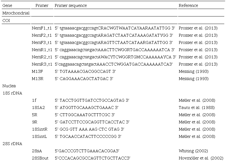 Total DNA extraction of a single specimen was carried out using Chelex 100 (Bio-Rad) following the protocol provided by the manufacturer. Polymerase chain reactions (PCR) used 9.5 μl of DNase-free H2O, 3 μl of 5× Reaction Buffer, 0.2 μl of each primer, 0.1 μl of My Taq DNA polymerase (Bioline catalogue number BIO-21105), and 2 μl of DNA template (total volume 15 μl) for each sample. For PCR reactions with primer cocktail, the amount of DNase-free H2O was adjusted to reach a total volume of 15 μl. Mitochondrial cytochrome c oxidase subunit I (COI) DNA sequence was obtained using a primer cocktail with forward NemF1_t1+NemF2_t1+ NemF3_t1 and reverse NemR1_t1+NemR2_t1+ NemR3_t1; including 0.2 μl of each primer. PCR conditions were 94 °C for 2 min, 5 cycles at 94 °C for 40 sec, 45 °C for 40 sec, 72 °C for 1 min, followed by 35 cycles at 94 °C for 40 sec, 51 °C for 40 sec, 72 °C for 1 min, and a final extension at 72 °C for 7 min (modified from Prosser et al. [2013]). For the nuclear 18S ribosomal RNA (18S rRNA) PCR reactions, the primer cocktail included 1f+18SA2+5R+9R. PCR reactions were performed with initial denaturation at 95 ºC for 2 min followed by 35 cycles with 94 ºC for 1 min, 56 ºC for 45 sec, and 72 ºC for 45 sec, with an additional 10 min extension at 72 ºC. For the nuclear 28S ribosomal RNA (28S rRNA) amplification the primers 28sA+28SBout were used. PCR was performed with initial denaturation at 94 ºC for 5 min, followed by 35 cycles of 95 ºC for 1 min, 52 ºC for 1 min, 70 ºC for 1 min, and final extension at 72 ºC for 7 min (modified from Phillips et al. [2010]). Primer names and sequences are listed in Table 1. Amplification products were purified using CentriSep (Thermo Fisher Scientific) 96 filter plates with Sephadex G-50. Sequencing reactions used 0.4 µl BigDye Terminator ver. 3.1 (Applied Biosystems), 2 µl Buffer 5x, 4 µl ddH2O, 1 µl of primer at 10 µM, and 3 µl purified PCR product (total volume 10 µl). Primers M13F and M13R were used for sequencing the COI fragment while 18SintL and 18SintR were used for 18S. Samples were purified using Sephadex G-50, then 25 µl of 0.5 mM EDTA was added to each sample and finally sequenced in an ABI-PRISM 3100 Applied Biosystems® sequencer at LANABIO. Sequences were reconciled and edited in Geneious ver. 5.1.7 (Biomatters Ltd. Auckland, New Zealand).