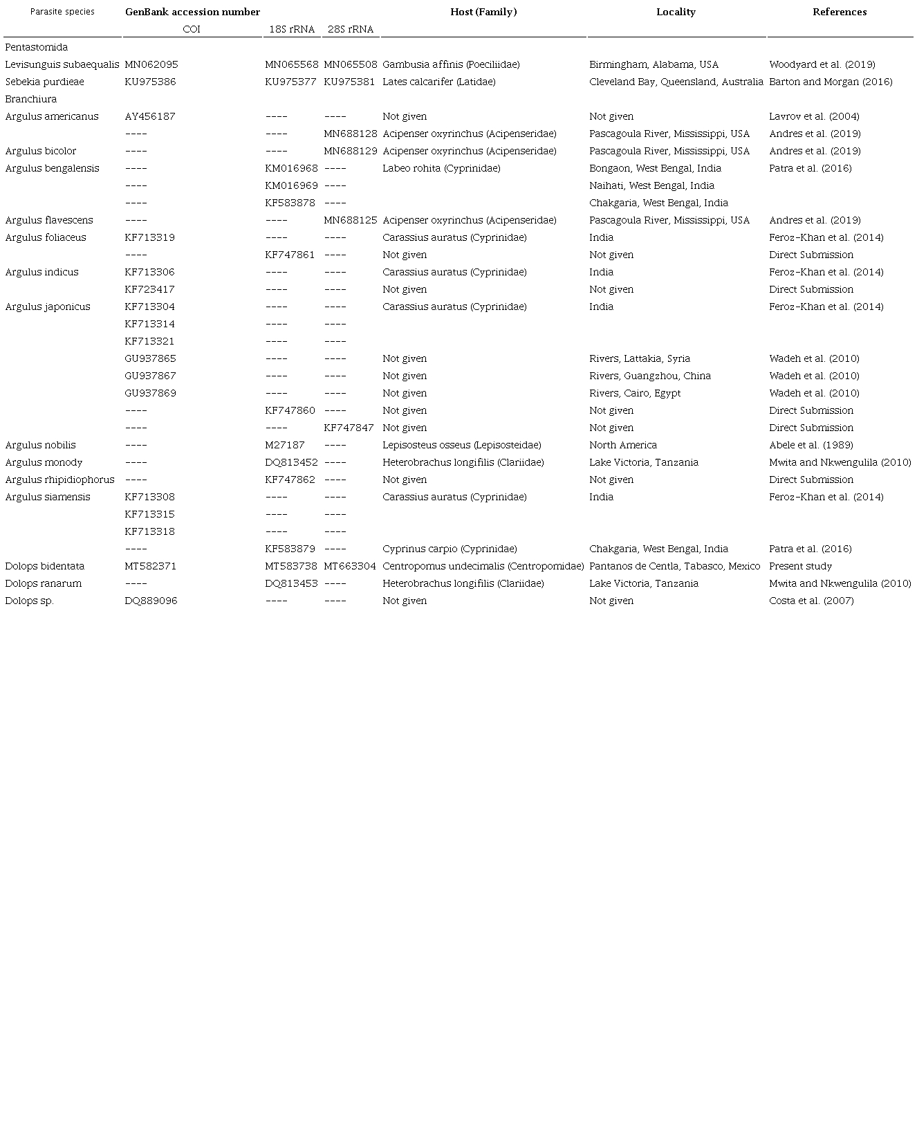 Keywords: Parasitic crustaceans, Branchiura, Argulus, Centropomus undecimalis, COI, 18S rRNA, 28S rRNA.