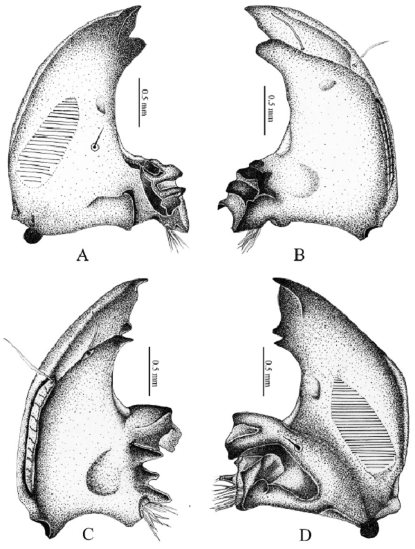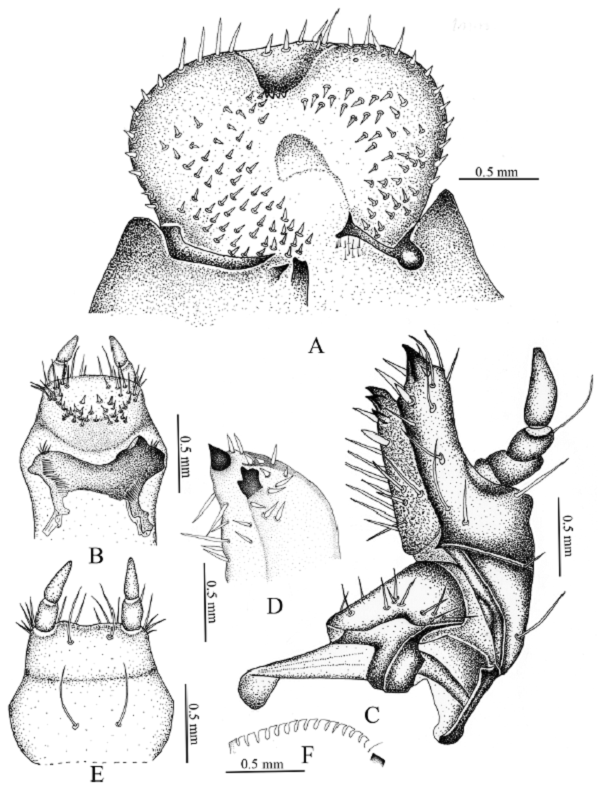 Cabeza (fig. 1A). Amplitud de la cápsula cefálica 4.44-4.23 mm. La cabeza de color negro, con la superficie del cráneo finamente punteada. Frente con 2 sedas dorsoepicraneales; 6 sedas epicraneales diminutas; 1 seda frontal posterior a cada lado; sedas frontales exteriores y anteriores ausentes; 1 seda en el ángulo frontal anterior en cada lado; 1 seda al lado de cada estemma; superficie con 10 sedas dispersas cortas, espiniformes. Estemata pigmentado y claramente desarrollado. Clípeo (fig. 1A). Con 1 seda lateral a cada lado y sin sedas centrales; postclípeo sin sedas. Labro (fig. 1A). Subtrapezoidal, con 2 sedas posteriores, 2 sedas centrales, 4 sedas laterales a cada lado, 2 sedas apicales delgadas y largas. Epifaringe (fig. 2A). Ligeramente asimétrica (1.61 mm de ancho por 1.12 mm de largo). Epizigum corto y amplio, de color pardo obscuro, haptomerum con 3-4 heli apicales amplios; plegmatia, proplegmatia y clithra ausentes; corypha con 6-8 sedas delgadas y largas. Acroparia con 16-18 sedas delgadas y largas; acanthoparia con 9-12 sedas cortas, espiniformes y recurvadas. Chaetoparia izquierda con 42 sedas cortas y gruesas, 43 sedas largas y delgadas; Chaetoparia derecha con 28 sedas cortas y gruesas, 35 sedas largas y delgadas. Dexiotoma larga y moderadamente amplia; pterotoma desarrollada y redondeada; laeotorma delgadas y dilatada apicalmente hacía el pedium; dexiotorma más larga de la laeotorma. Laephoba ausente. Haptolechus y margen interno de la laeotorma formado por 15 sedas delgadas y largas; haptolechus con 4 macrosensilas. Dexiophoba ausente; placa esclerosada corta con 4 sensilias; placa esclerosada delgas y apicalmente aguda. Crepis estrecho, ligeramente esclerozado y discontinuo mesalmente. Mandíbula izquierda (fig. 3A-C). Área incisiva con 3 dientes (S1, S2 y S3), el tercer diente (S3) separado por escotadura incisiva; área molar con 2 lóbulos amplios, convexo (M1-2), lóbulo distal (M1) desarrollado; escrobe con 5 sedas delgadas y largas; 4 sedas cortas y delgadas basolaterales; brustia formada por 20 sedas delgadas y moderadamente largas; acia elongada con 12 sedas en la base y el ápice; proceso ventral desarrollado con muchos asperitos. Área ventral con 38 líneas estridulatorias mandibular y 8 sedas dorsomolares. Área dorsal con 10 setas dorsomolares. Mandíbula derecha (fig. 3B-D). Área incisiva con 3 dientes (S1, S2 y S3), el tercer diente (S3), está separado por una escotadura incisiva; área molar con 2 lóbulos amplios, convexo (M1-3), lóbulo distal (M1) desarrollado; escrobe con 6 sedas delgadas y largas; 8 sedas cortas y delgadas basolaterales; calx desarrollado, truncado apicalmente; brustia formada por 14 sedas delgadas y largas; proceso ventral desarrollado, con asperitos. Área ventral con 35-36 líneas estridulatorias mandibulares y 9 sedas dorsomolares. Área dorsal con 1 seda dorsomolar. Maxilas (fig. 2C). Con 1 uncus en la galea; lacinia con 3 unci unidos en la base, rodeados por 9 heli. Área estridulatoria maxilar (fig 2F) formada por 15 dientes amplios, truncados y en direc postero-anterior, los 2 últimos dientes separados d precedentes; proceso anterior presente. Labio (fig. 2-E). Escleroma hipofaríngeo asimétrico, con el lado derecho prominente y el izquierdo reducido; lóbulo lateral derecho con 21 sedas largas y delgadas; lóbulo lateral izquierdo 11 sedas delgadas y largas, 8 sedas cortas y delgadas. Glosa con 34 sedas delgadas y largas laterales y 40 sedas cortas y delgadas; 20 sedas cortas, espiniformes sobre una placa esclerosada en el centro. Antena (fig. 1B, C). Segundo antenómero 2 veces el largo del primero, tercer antenómero con proceso ventral apical soportando un punto sensorial. Último antenómero con 6-7 puntos sensoriales dorsales y 5-6 puntos sensoriales ventrales.