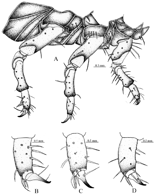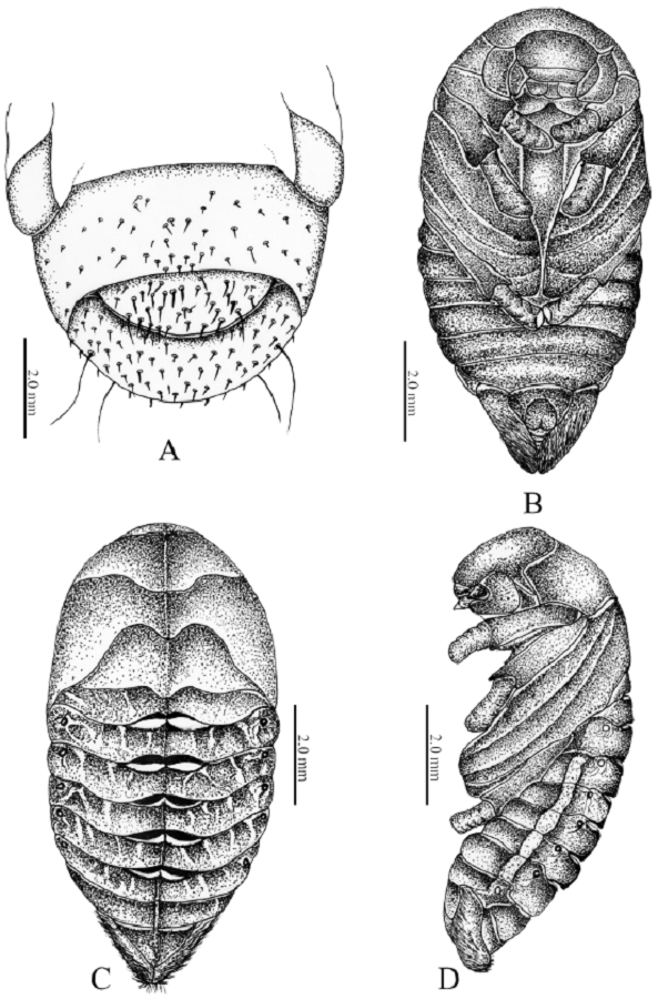 Tórax (fig. 4A). Pronoto con escleroma lateral corto a cada lado, de color amarillo claro, con 3 sedas delgadas y largas. Estigma respiratorio torácico (fig. 6B) más pequeño que los abdominales, 0.42 mm de ancho por 0.55 mm de largo; placa respiratoria de color amarillo rojizo, con forma de "C"; distancia entre lóbulos de placa respiratoria menor que el diámetro dorsoventral de la bulla; bulla redondeada y prominente. Orificios de las placas respiratorias de borde irregular; 32-39 orificios a través de la placa respiratoria (fig. 6C). Dorso del protórax con línea de 4 sedas delgadas y largas, 2 sedas delgadas y largas y 16 sedas cortas espiniformes; mesoprescudo con 2 sedas delgadas y cortas; mesoescutelo con 9 sedas cortas espiniformes; metaprescudo con 2 sedas delgadas y cortas, 17 sedas cortas espiniformes; metaescudo con 2 sedas delgadas y largas, 20 sedas delgadas y cortas y 16 cortas espiniformes; metaescutelo con 9 sedas cortas espiniformes. Patas (fig. 4B-D). Mesotarsungulo más pequeños que pro- y metatarsúngulos, todos los tarsúngulos alargados, con ápice agudo, con 1 seda basal interna y 1 seda prebasal externa.