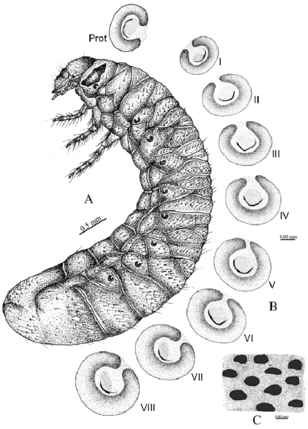 Las observaciones e ilustraciones se realizaron con la ayuda de un estereomicroscopio Leica S8AP0. Los caracteres y la terminología utilizada en las descripciones se basan en los trabajos de Böving (1936, 1942), Ritcher (1948, 1966), Morón (1987, 1997), Ibarra-Polesel et al. (2017, 2020).