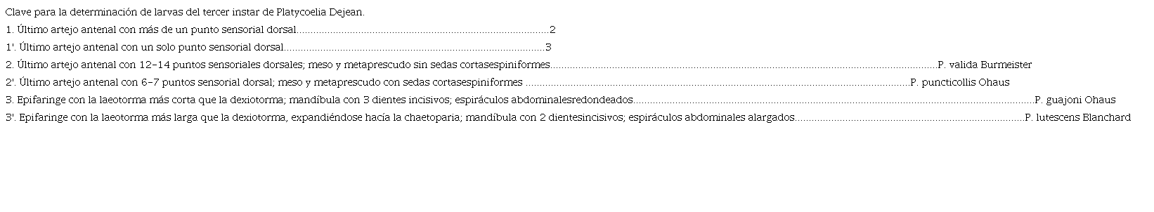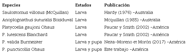 En Colombia se han reportado 24 de las 62 especies descritas para el género Platycoelia (Smith, 2003). Las larvas de Platycoelia se diferencian de las de otros géneros de la subfamilia Rutelinae por la siguiente combinación de caracteres: haptomerum de la epifaringe prominente, sin línea primaria y secundaria de heli basales, con heli apicales gruesos; lacinia con 3 unci fusionados en su base; área estridulatoria maxilar con 6-15 dientes recurvados postero-anteriormente, apicalmente agudos; 1 o más puntos sensoriales dorsales en el último artejo antenal (más de 1 en P. valida Burmeister = 12-14 puntos sensoriales); abertura anal ligeramente curvada (Neita-Moreno y Morón, 2017). Los estados inmaduros de la tribu han sido descritos tan solo para 6 especies, siendo Platycoelia el género con más estados inmaduros conocidos (tabla 1).