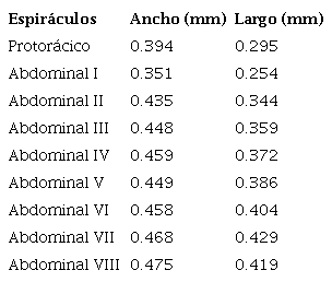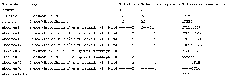 Abdomen. Placas respiratorias de color marrón oscuro, regularmente recurvada en forma de "C", la distancia entre los lóbulos de la placa respiratoria es menor que el diámetro dorsoventral de la bulla; bulla redondeada y prominente. Estigmas del segmento abdominal I más pequeños (0.57 mm de largo por 0.36 mm de ancho) que los estigmas de los II-VIII, los cuales incrementan progresivamente su tamaño (tabla 2). Primer segmento abdominal con una proporción de sedas delgadas y largas que se distribuyen a lo largo de las áreas presentes en él. Esta quetotaxia de distribuyen igualmente a lo largo de los otros segmentos abdominales (tabla 3).