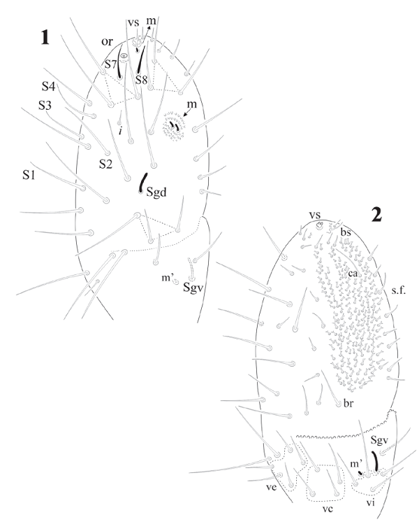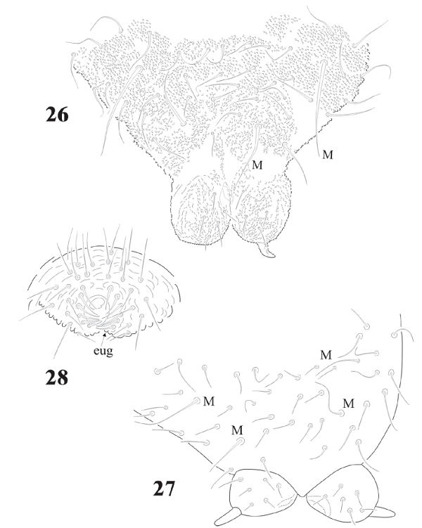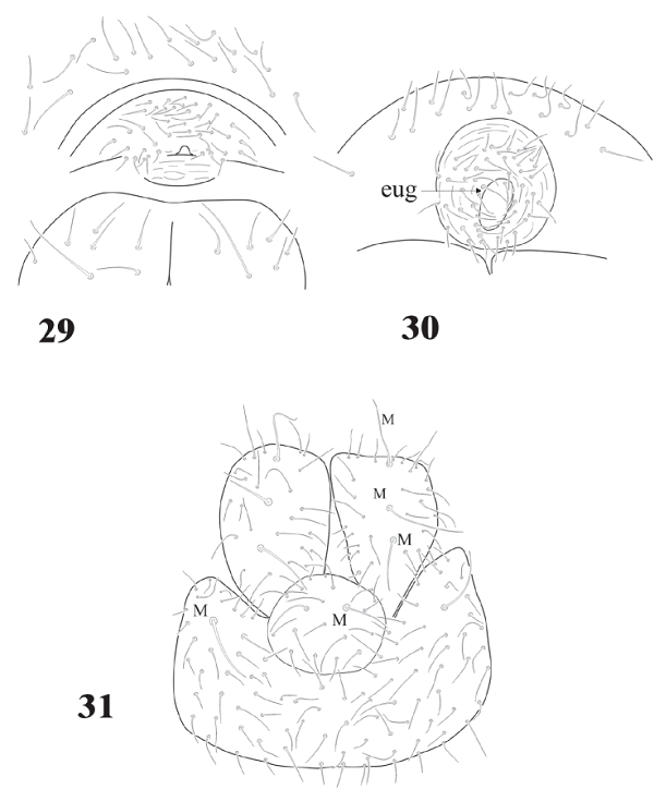 Genital plates of females and males with 12-32 pregenital setae, 26-56 circumgenital setae, females with 1 + 1 eugenital (Fig. 29), males 6 + 6 eugenital setae shorter and thicker than circumgenital (Figs. 28, 30). Abd. VI completely hidden under Abd. V. Ventral side of Abd. V with about 100 setae and 1 pair of macrosetae (Fig. 31). Lav with 24-36 setae of different sizes and 3 macrosetae each. Pav with 1 pair of macrosetae and about 20 setae. None of them as h.r setae. Abd. V with 1 pair of dorsal sensilla (Fig. 32) at the hind edge of body.