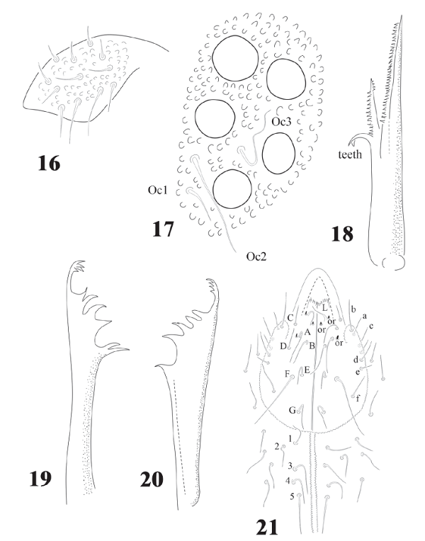 Head with strong hypertrichosis. Labrum with 2/2, 3, 3, 2, 2 (Fig.16). 5 + 5 eyes, ocular area with 3 setae, Oc2 the longest (Fig.17), no postantennal organ. Capitulum of maxilla with 3 lamellae, of which 2 fused and strongly serrated, the longest with about 30 serrations, the smallest with 15 and 1 elongated and curved basal tooth (Fig. 18). Buccal cone short, labium with characteristic setae for the family, including the tuberculate setae L and 3 sensorial x organs per side (Fig. 21). Mandible with 10 teeth, 4 apical, 4 strong median teeth, and 1 basal (Fig. 20) or 2 teeth (Fig. 19). Postlabial setae from 3 to 5 pairs (Fig. 21), often with asymmetries.