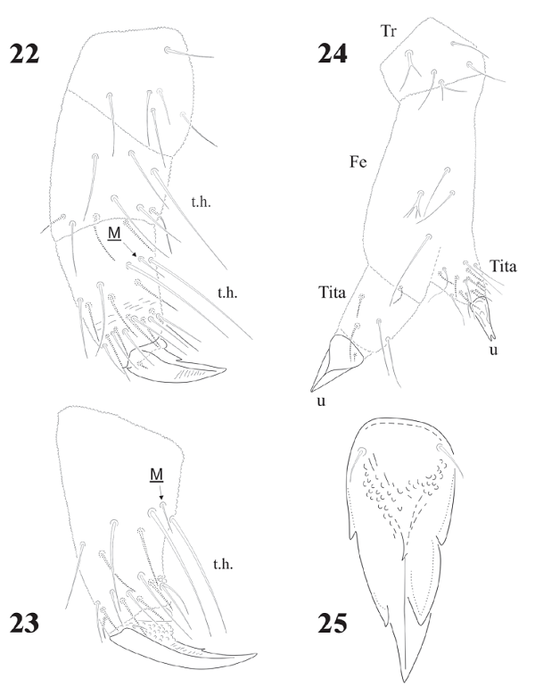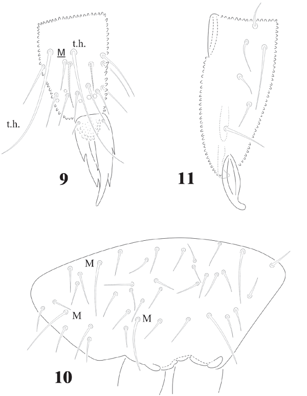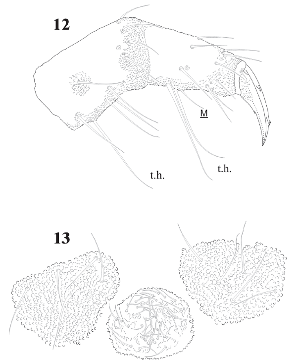Chaetotaxy from subcoxae to tibiotarsi I-III: 0?, 3, 6, 12, 19; 3, 8, 6, 12, 19; 3, 8, 6, 11, 18. (Figs. 9, 12). Femora with one ventral acuminate t.h. on each leg (Fig. 12). Tita. with 2 long acuminate t.h. ventrally on proximal verticil (Figs. 9,12). Seta M between both t.h. unguis with 1 median tooth and 2 pairs of strong lateral teeth on each side, better seen in ventral view (Fig. 9). Pretarsus with 2 setae.