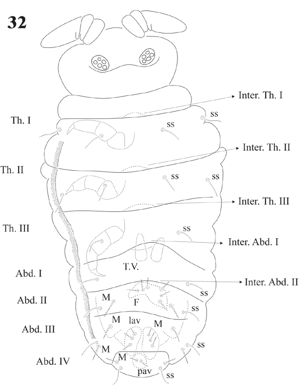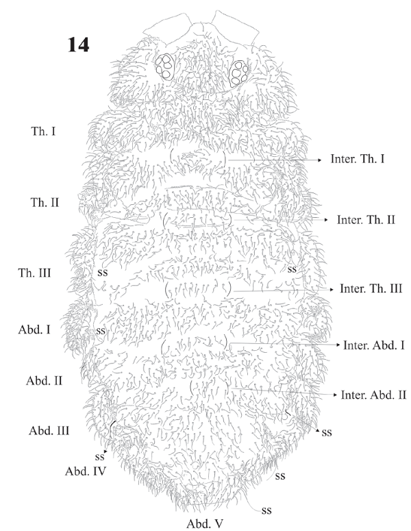 Dorsal sensilla formula by demitergite: 0, 2, 2/1, 1, 1, 1, 1. Dorsally with very abundant small setae, intertergal areas with few setae. Inter. Th. I, II, III and Inter. Abd. I and II usually with 8 + 8 setae (Fig. 14).