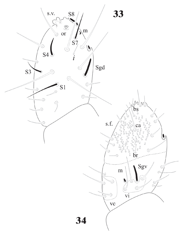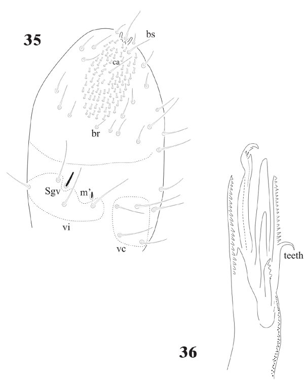The sensilla on Ant. IV of juveniles and adults C. dentata are difficult to distinguish, except for S7 and S8 (Fig. 1), others are very similar to the ordinary setae. In D. globulosa there are several very short and small apical sensilla (12 or more) and a few other (about 4) longer (Fig. 15). Notachorudina patagonica has 6 dorsal sensilla, as illustrated in figure 12 by Queiroz and Zeppelini (2017), but juveniles lack some of them (Fig. 33), but the antennal organ III (Fig. 34) is hidden behind a big cuticular fold and strongly displaced forwards as it happens in members of Neotropiella. For the ventral chaetotaxy of Ant. III in C. dentata (Fig. 2) there are 3 groups of setae (vi, vc, and ve) as described by Smolis (2008) in Endonura (Neanurinae: Neanurini), but in D. globulosa and N. patagonica only groups vi and vc are easy to distinguish and they have 4 setae in both cases (Figs. 15, 35). On the ventral side of Ant. IV of C. dentata (Fig. 2) and N. patagonica (Fig. 34) there is a well-defined ventral file and the setae groups br, ca, and bs also defined by Smolis (2008) but in D. globulosa there are many small acuminate setae not modified in the form of a sensorial file.