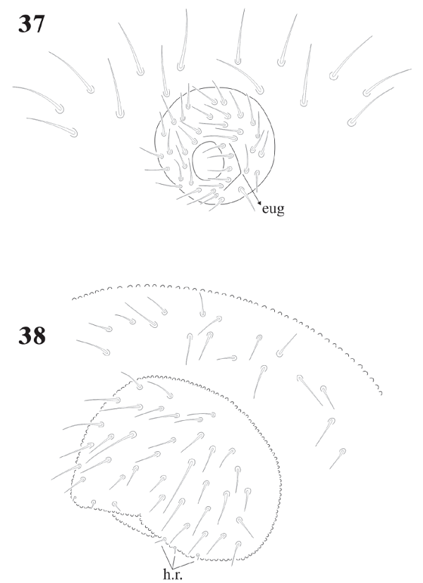 Female genital plate with 16 pregenital, 11 circumgenital, and 1+1 eugenital setae; male plate with 14 pregenital, about 30 circumgenital, and 5 + 5 eugenital setae (Fig. 37). Juveniles have the same number of pregenital setae, but shorter (Fig. 38).