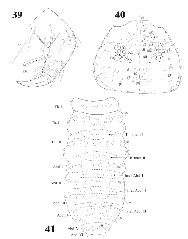 Eyes 8 + 8, PAO absent. Dorsal head chaetotaxy with small plurichaetosis: a0 present and other medial setae present; rows d1-5 and sd1-5 normal; rows c and p with 3 setae per side (Fig. 40) like Cassagnaurida dentata. Mandible with 9 teeth, basal one with many small denticles basally. Maxillary head with 2 strong teeth, 4 serrate lamellae (one of them with a big basal tooth), and one long and thin lamella with several small apical teeth and one short with a few teeth (Fig. 36). Labium truncate with setae A and C longer than B and D with papillated seta L and x organs absent. Thorax and abdomen with moderate pluritrichoses (Figs. 40, 41) very similar to C. dentata with several small microsetae and long sensilla with intertergal areas from Th. II to Abd. III. Th. I with 8 + 8 setae in 2 rows and 3 laterals. Interseg. Th. II with 2 + 2 setae; interseg. Th. III with 3 + 3; interseg. Abd. I with 6 + 6 setae and interseg. III with 5 + 5 setae. Sensillar formula by demitergite: 022/11111. Abd. V with 5 + 5 setae between sensilla. Tita. with 2 acuminate t.h. and seda M between them. Lateral anal valves not clearly separated with 3 h.r. each (Fig. 38) since the first instar to adults.