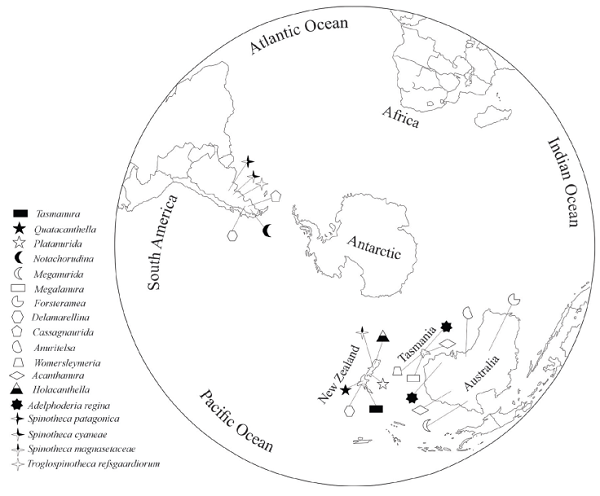 An update of the original observations of Rapoport (1971) is necessary and the proposals about Collembola biogeography of Christiansen and Bellinger (1995) need to be reviewed. Most springtails closely related to Patagonian Pseudachorutinae are mainly distributed in Tasmania, Australia, and New Zealand, restricted to the Southern Hemisphere. A similar case is Spinothecidae (Fig. 42) which is represented by Adelphoderia regina in Australia and Tasmania, Spinotheca magnasetaceae in New Zealand, S. cyaneae and S. patagonica both in Nothofagus forest from Patagonia, and one endemic genus and species Troglospinotheca refsgaardiorum discovered in Caverna del Leon in an arid area (Las Lajas) in Neuquen, Argentina (Palacios-Vargas, 1999).