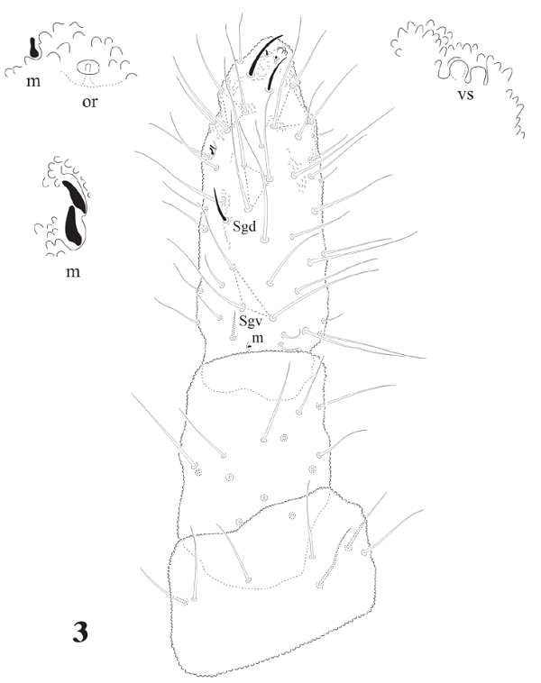 Ant. III and IV dorsally fused (Figs. 1, 3), Ant. III organ displaced to Ant. IV, 2 microsensilla in one depression but not cuticular fold, far above Sgv at level of seta i. Sgv and Sgd about the same length. Ant. I with 7 setae, Ant. II with 13 setae, Ant. III with 21 setae (Fig. 3). Apical bulb trilobed, 1 spherical organ “or” and 1 microsensillum; Sensilla of Ant. IV difficult to distinguish, only 2 well differentiated dorsal and several long acuminate setae. Sensorial ventral file with up to 225 modified setae in 8-9 irregular longitudinal rows (Fig. 2).