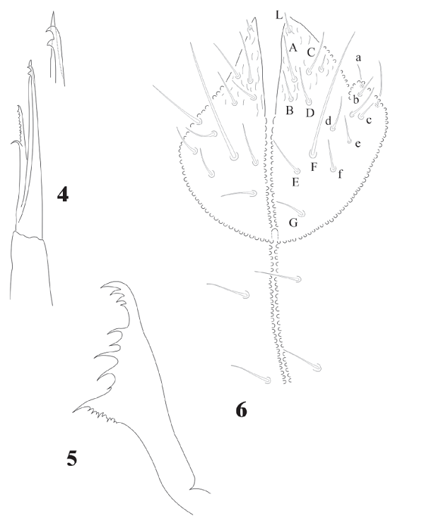 Head chaetotaxy in Fig. 7; 3 + 3 setae p and c, 3 ocular setae. 8 + 8 subequal eyes; very small circular PAO with 4-8 tubercles in a circle less than 1/4 the diameter of the closest eye (magnification in Fig. 7). Labrum formulae 4/2, 2, 4, 2, 2. Mandible with 10 teeth of different size, proximal one with ventral small denticulations (Fig. 5); elongated maxillary capitulum, with 3 lamellae, one finely serrate with 1 big curved basal tooth, and 2 long lamellae partially fused, one with acuminate tip and the other with 2 curved apical teeth (Fig. 4). Moderately elongated labium with setae A-G and papillated seta L; 2 pairs of postlabial setae (Fig. 6).