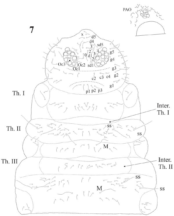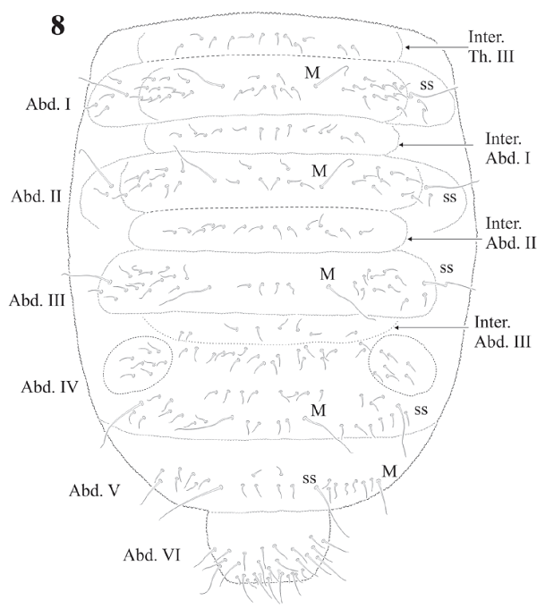 The sensillar formula by demitergite as: 0, 2, 2/1, 1, 1, 1, 1 and 1 pair of strong macrosetae from Th. II to Abd. IV, giving the appearance of having 3 ss on Th. II and III and 2 pairs on each abdominal segment (Figs. 7, 8). Thoracic chaetotaxy on figure 7. Th. I with 10 + 10 setae in 2 irregular rows and 2 lateral setae on each paratergal area, one elongated. Th. II with 22 + 22 setae in 3 irregular rows, 2 + 2 sensorial setae and 1 pair of macrosetae. Paratergal areas of Th. II with 3 subequal setae, intertergal area Th. II-III with 7 + 7 setae. Th. III with 20 + 20 setae in 2 irregular rows and 2 + 2 sensorial setae and 1 pair of macrosetae, intertergal area Th. III-Abd. I with 7 + 7 setae. Paratergal areas with 3-5 setae each.