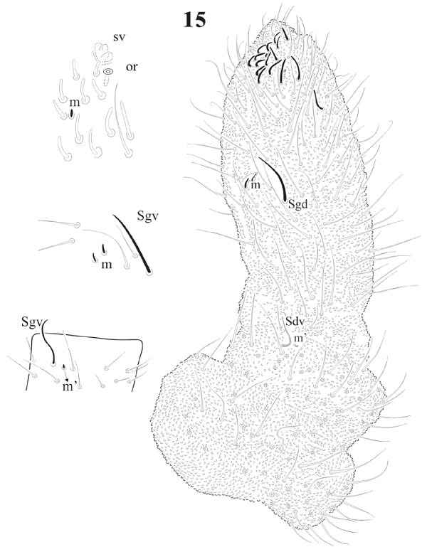 Antenna shorter than cephalic diagonal (ratio: 0.9: 1) with many setae (Fig. 15). Ant. IV dorsally fused to III; ventrally clearly separate. Dorsal apex with 8 -18 small, geniculate, cylindrical sensilla. Apical bulb very small and trilobed, 1 microsensillum and 1 subapical spherical organ. Ventrally there are about 110 short and acuminate small setae but no real file. Ant. III short with about 42 setae, sensorial organ with 2 short microsensilla not under a cuticular fold (about the same size of sensilla of Ant. IV). Sgd curved, long and acuminate (as ordinary seta) located dorsally in the middle part of fused dorsal Ant. III and IV; Sgv, long and sinuous, about half the length of Sgd, and close to ventral m’ (Fig. 15). Ant. II with about 50 setae, 15-17 dorsal and 29 ventral setae. Ant. I with about 55 setae, 20-22 dorsal and 33-35 ventral setae (Fig. 15).